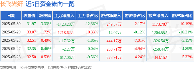 本站消息易融资,截至2025年5月30日收盘,长飞光纤(601869)报收于31.97元,下跌3.33%,换手率0.88%,成交量3.57万手,成交额1.15亿元。